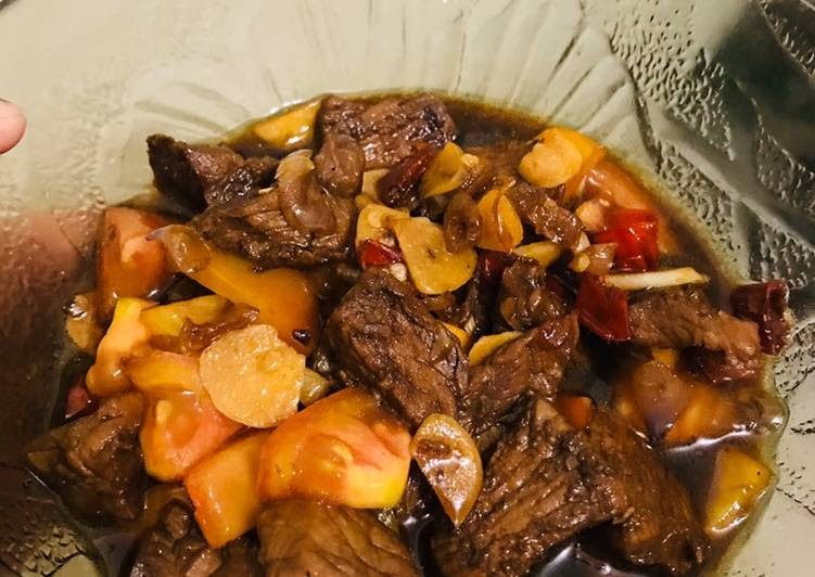Potong daging dan celupkan ke dalam parutan nanas. 4 sendok makan kecap manis. Tambahkan kecap manis, kecap inggris, kecap asin, saos tiram dan saos sambal, aduk hingga rata, lalu tambahkan juga air kaldu. Masak daging dengan api sedang. Saat daging sudah mendidih (setengah matang) masukkan air sedikit demi sedikit sambil.